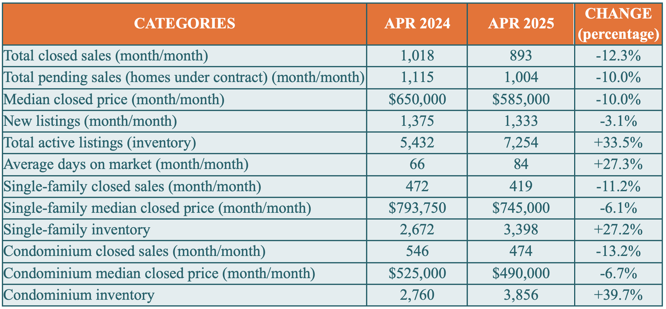 - Condominium: The median closed price for condominiums in April decreased 6.7 percent to $490,000 from $525,000 in April 2024.