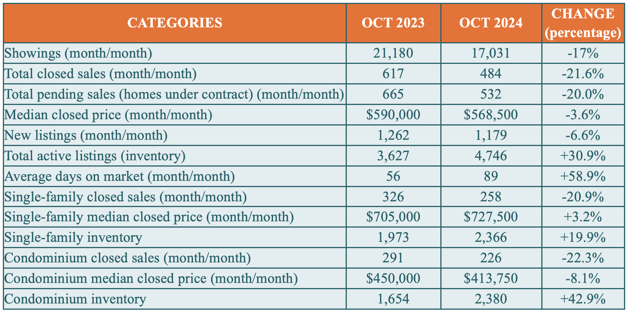 The overall median closed price in October was $568,500, a 3.6 percent decrease from $590,000 in October 2023. In the single-family home market, the median closed price increased 3.2 percent to $727,500 from $705,000 in October 2023. And for condominiums, the median closed price decreased 8.1 percent to $413,750 from $450,000 in October 2023.