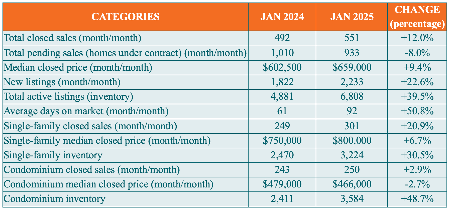 According to the January Market Report, closed sales of condominiums increased 2.9 percent compared to the single family home market, which had a 20.9 percent increase in closed sales. Further, the median closed price for condominiums decreased in January 2.7 percent to $466,000 from $479,000 in January 2024. But there was an increase in inventory for condominiums in January – 48.7 percent – to 3,584 condominiums from 2,411 condominiums in January 2024.