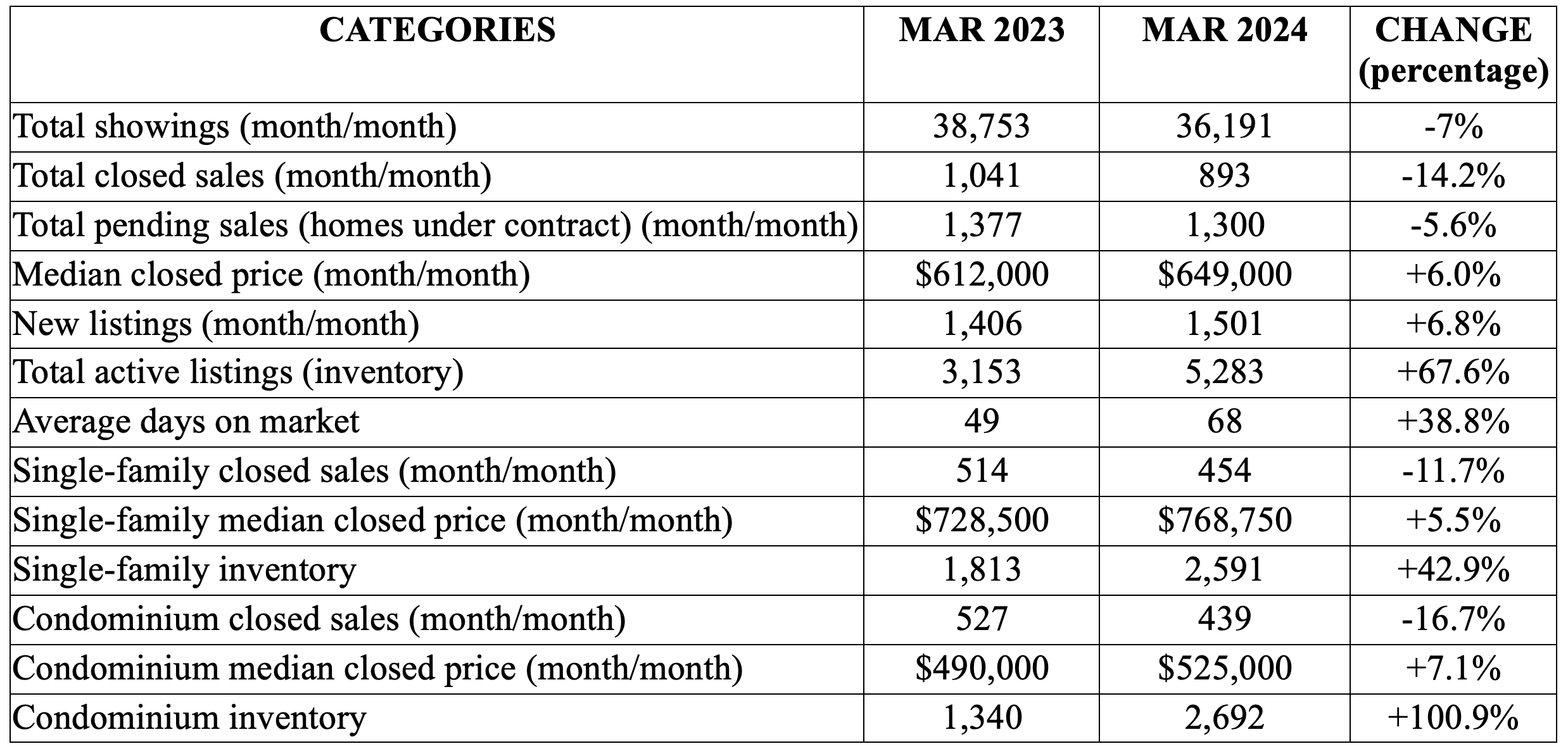 Closed sales in March decreased 14.2 percent to 893 from 1,041 closed sales in March 2023. While some analysts point to interest rates as the primary factor home sales have simmered recently, Budge Huskey, CEO, Premier Sotheby’s International Realty, remarked that “total price increases of homes over recent years are far more financially impactful than interest rates to a home buyer considering our average lower loan-to-value ratios and amount of cash.”