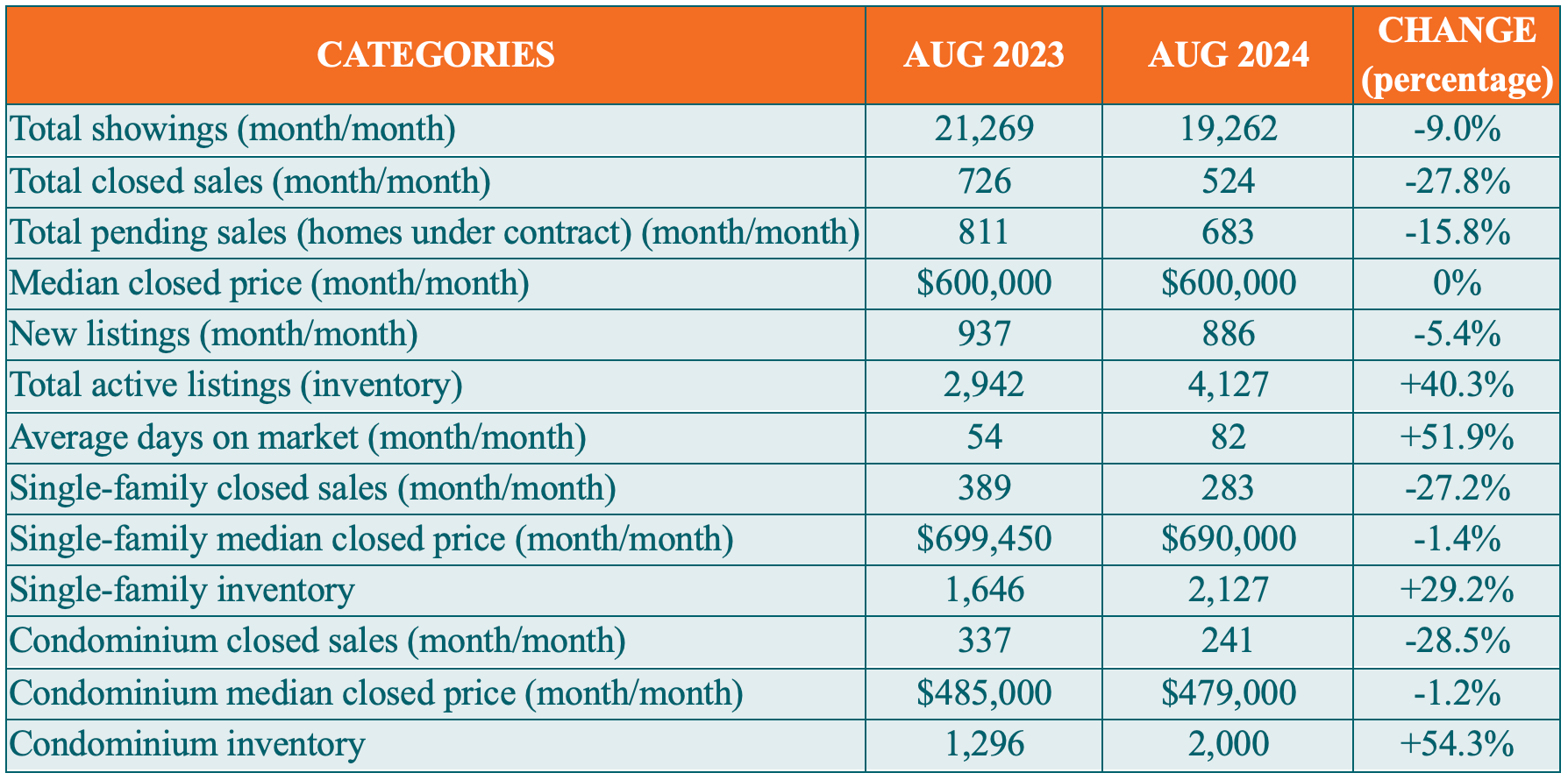 The median closed price for homes in Naples during August was $600,000; the same price reported in July 2024 and August 2023.