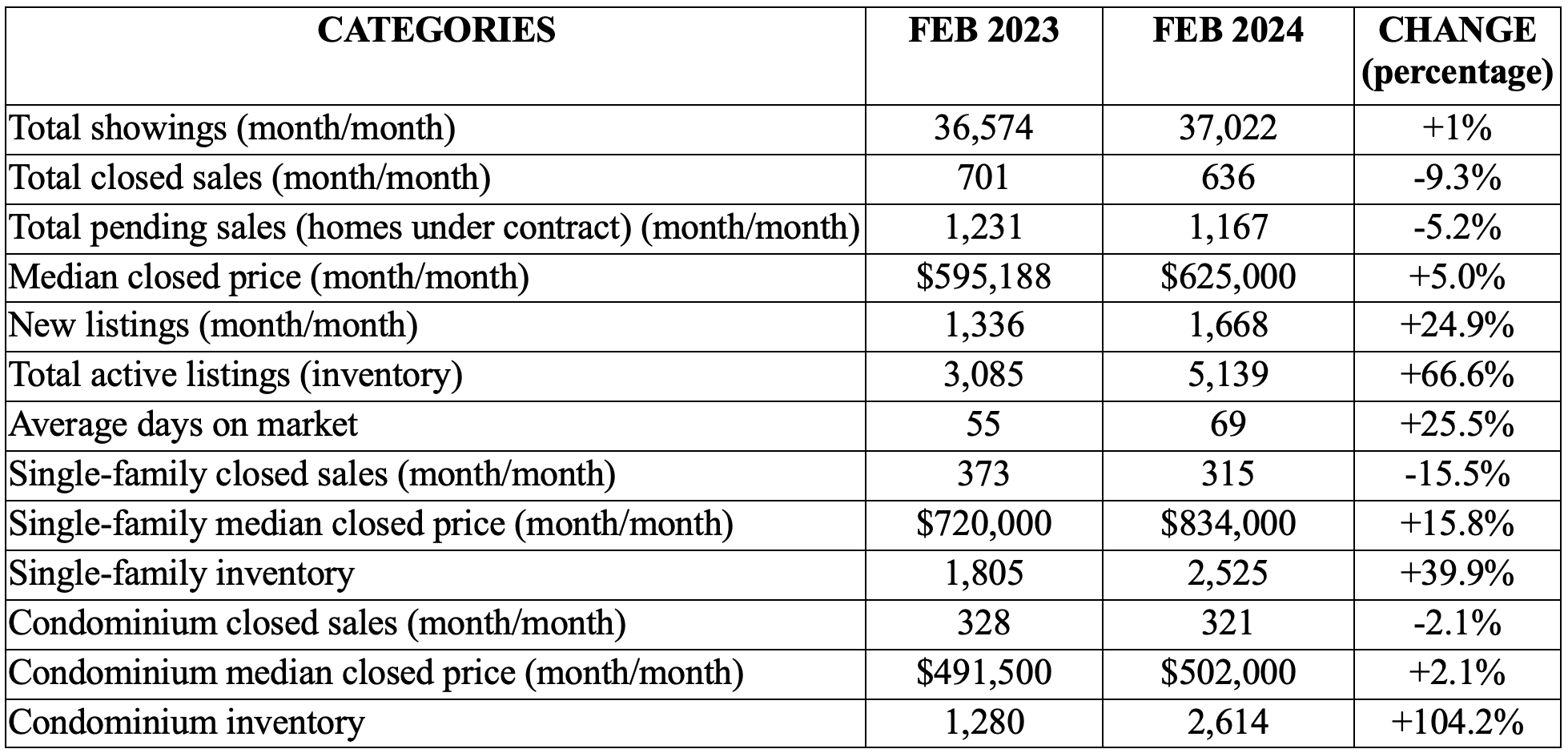 February’s price decreases demonstrate that REALTORS® are counseling sellers about realistic market pricing. Although some sellers are still struggling to accept the fact that the pandemic buying frenzy years with climbing price increases are over. As more new sellers enter the market (up 24.6 percent to 1,668 new listings from 1,336 new listings in February 2023), those sellers with overpriced properties risk missing an opportunity to attract and sell to eager buyers.