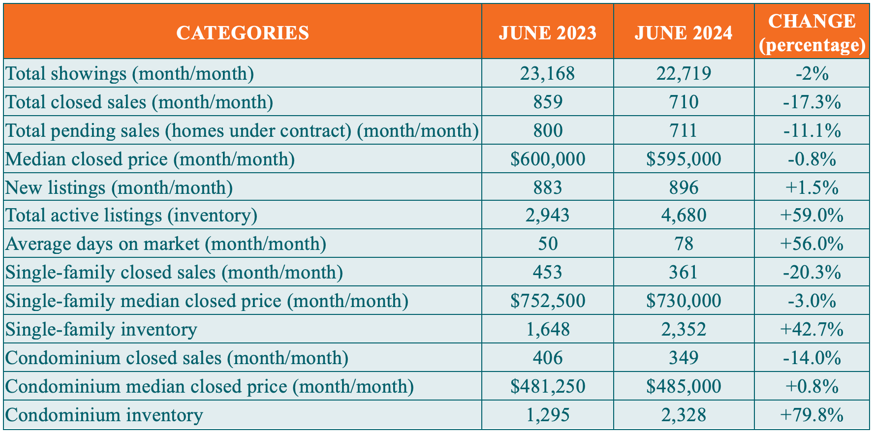 Summer buyers will enjoy more home options as the inventory of properties continues to rise compared to the last three years. In June, the 59 percent increase in inventory resulted in an available pool of 4,680 properties compared to only 2,943 properties during June 2023. Plus, confidence in the market remains steady with overall new listings in June increasing 1.5 percent to 896 new listings from 882 new listings in June 2023. Driving this influx of inventory was the number of new listings in the condominium market, which increased 9 percent compared to a 3.9 percent decrease in new listings for the single-family home market.